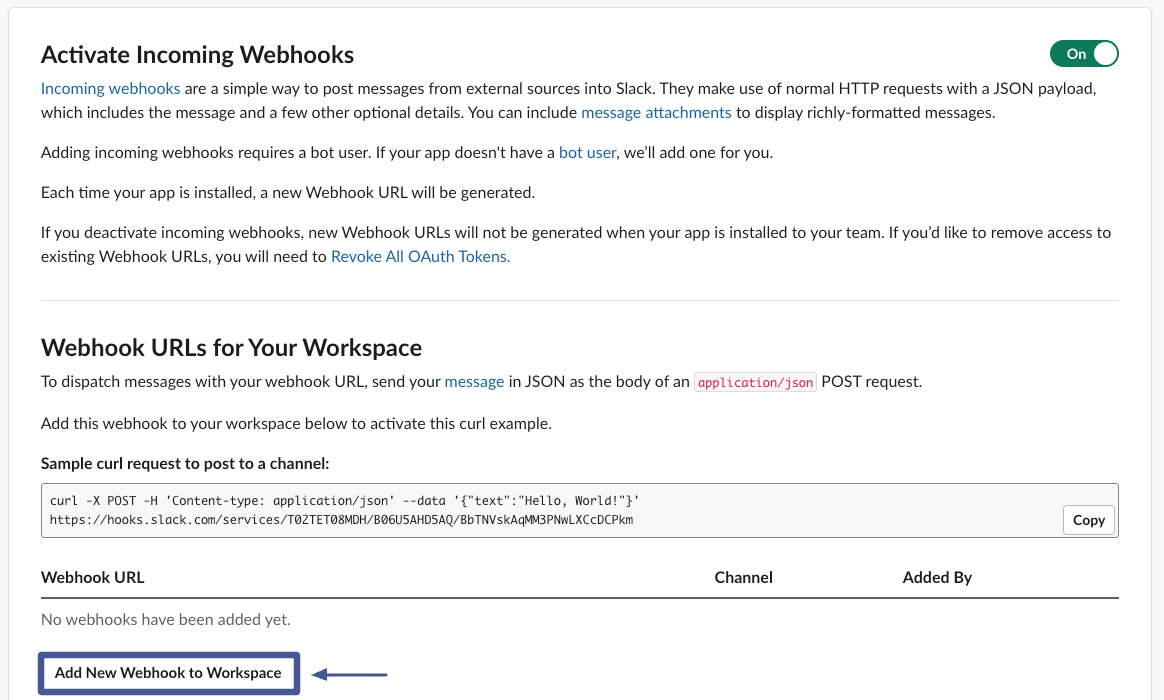 2. Enable Incoming Webhooks: in the left sidebar, click on Incoming Webhooks. Click the slider button in the top right to turn the feature on. Then click Add New Webhook to Workspace.